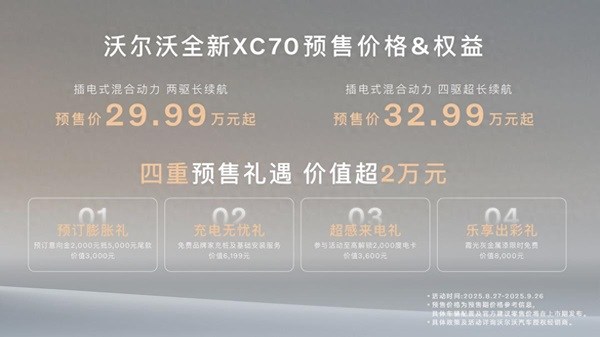 既想要豪华品牌的品质感,也想要新势力的科技体验,往往二者难以兼顾,而随着豪华车企积极拥抱新能源与智能化,如今这个现象逐渐被改善。8月27日,沃尔沃率先出手,基于SMA超级混动平台,带来一款全面革新的车型——全新XC70,新车今晚全球首发,并公布了预售价为29.99万起,价格蛮有诚意,同时还有价值超2万的四重预售权益。